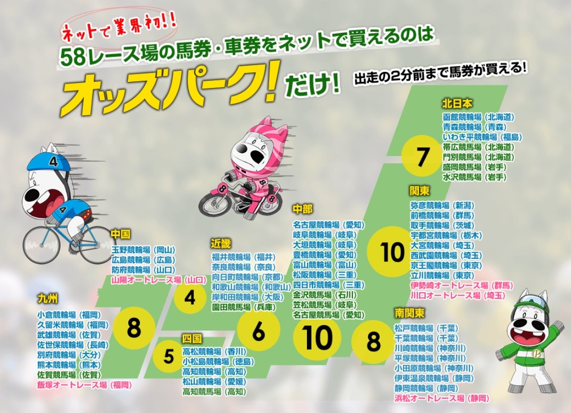 オッズパークは58ものレース場に投票出来ます!しかも無料なので気軽に加入出来て便利。