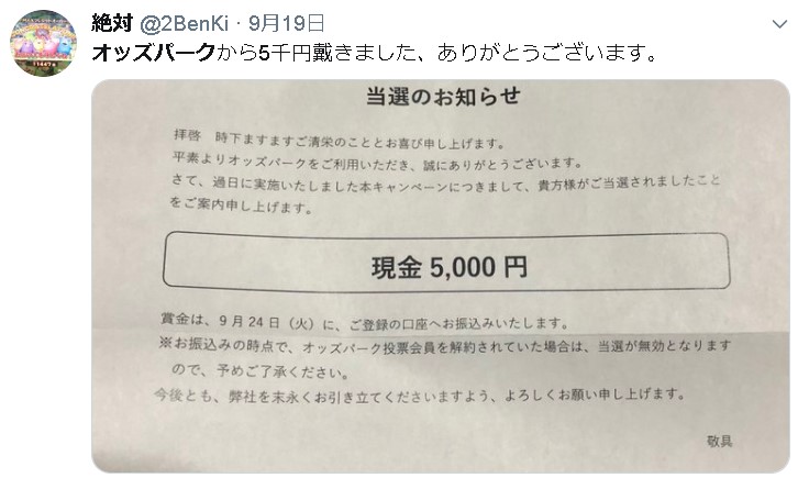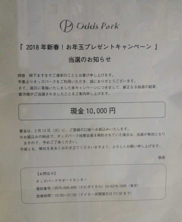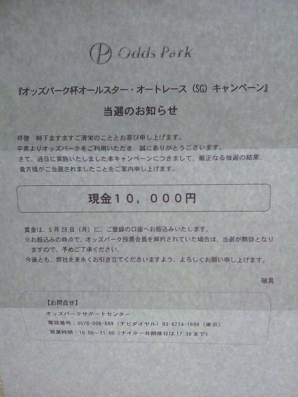 やりました。只今ポスト見ましたら、オッズパークから白い封筒届いていました。5000円でもありがたいと思ったのになんと、春の夜の競輪×オートレースキャンペーン30000円当選しました。10000円以上は初めてです。7月8日振り込みです。オズパさんありがとう。助かります。
